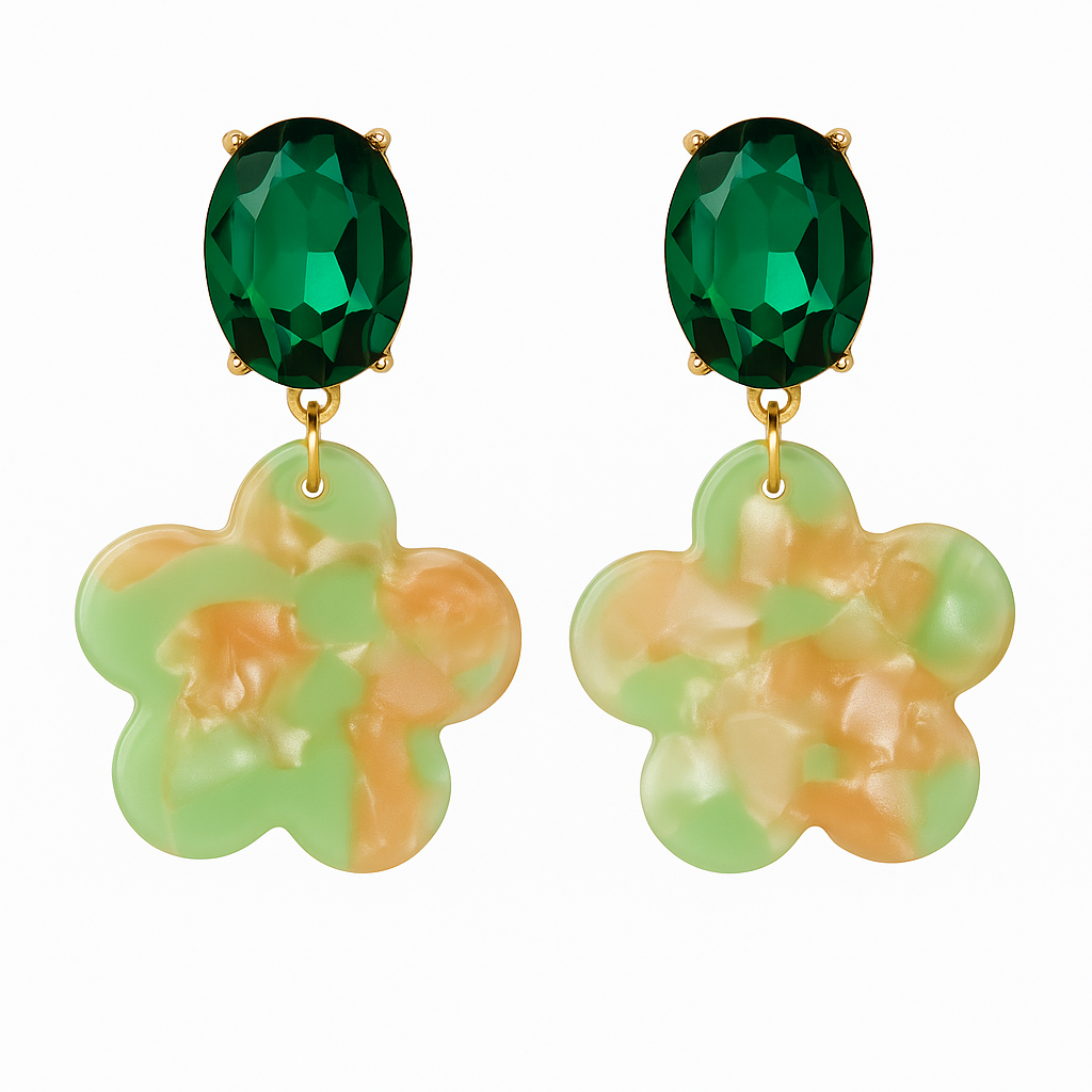 "Elevate your style with our exquisite Emerald Bloom Dangle Earrings, a harmonious blend of nature's beauty and sophisticated charm. These captivating earrings feature a radiant, oval-cut emerald green gemstone stud, beautifully complemented by a delicately detailed light green and cream flower dangle below. Crafted with gold-toned accents, these unique statement earrings add a touch of timeless elegance and a vibrant pop of color to any outfit. Perfect for special occasions or adding a chic flair to your everyday look, these floral drop earrings are designed to catch the eye and inspire compliments. Discover the perfect blend of natural grace and luxurious sparkle with these stunning green gemstone and flower earrings".