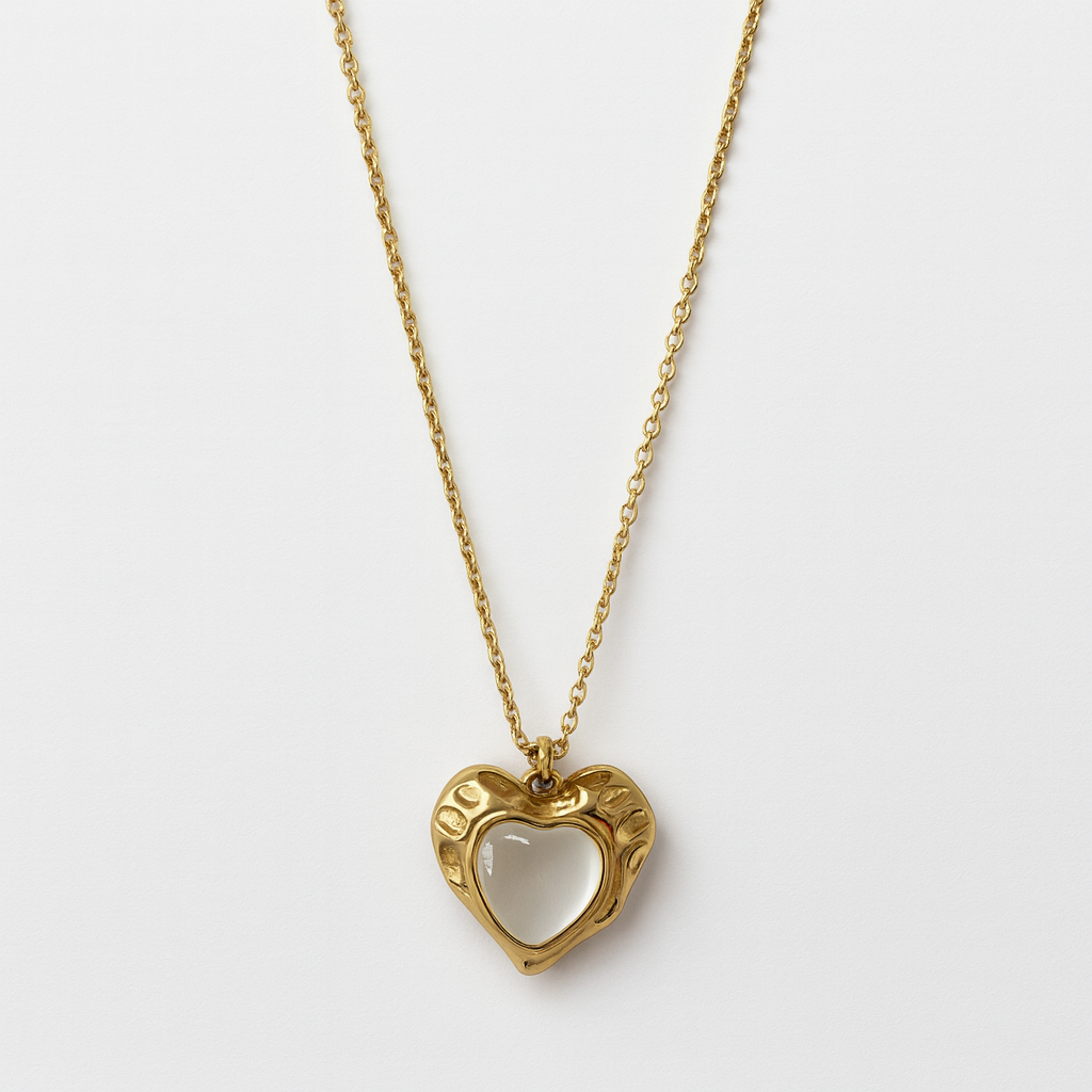 Discover timeless elegance with our Gilded Heart Radiance Necklace, a stunning gold-toned piece designed to capture hearts. This exquisite necklace features a beautifully textured, hammered-effect border around a captivating clear heart-shaped stone pendant. Perfect for adding a touch of romance and sophistication to any outfit, this unique heart necklace symbolizes enduring love and radiant beauty. Crafted with care, its versatile design makes it an ideal gift for anniversaries, birthdays, Valentine's Day, or a cherished expression of self-love. Elevate your style with this charming gold heart pendant necklace, designed for those who appreciate both classic sentiment and modern flair.