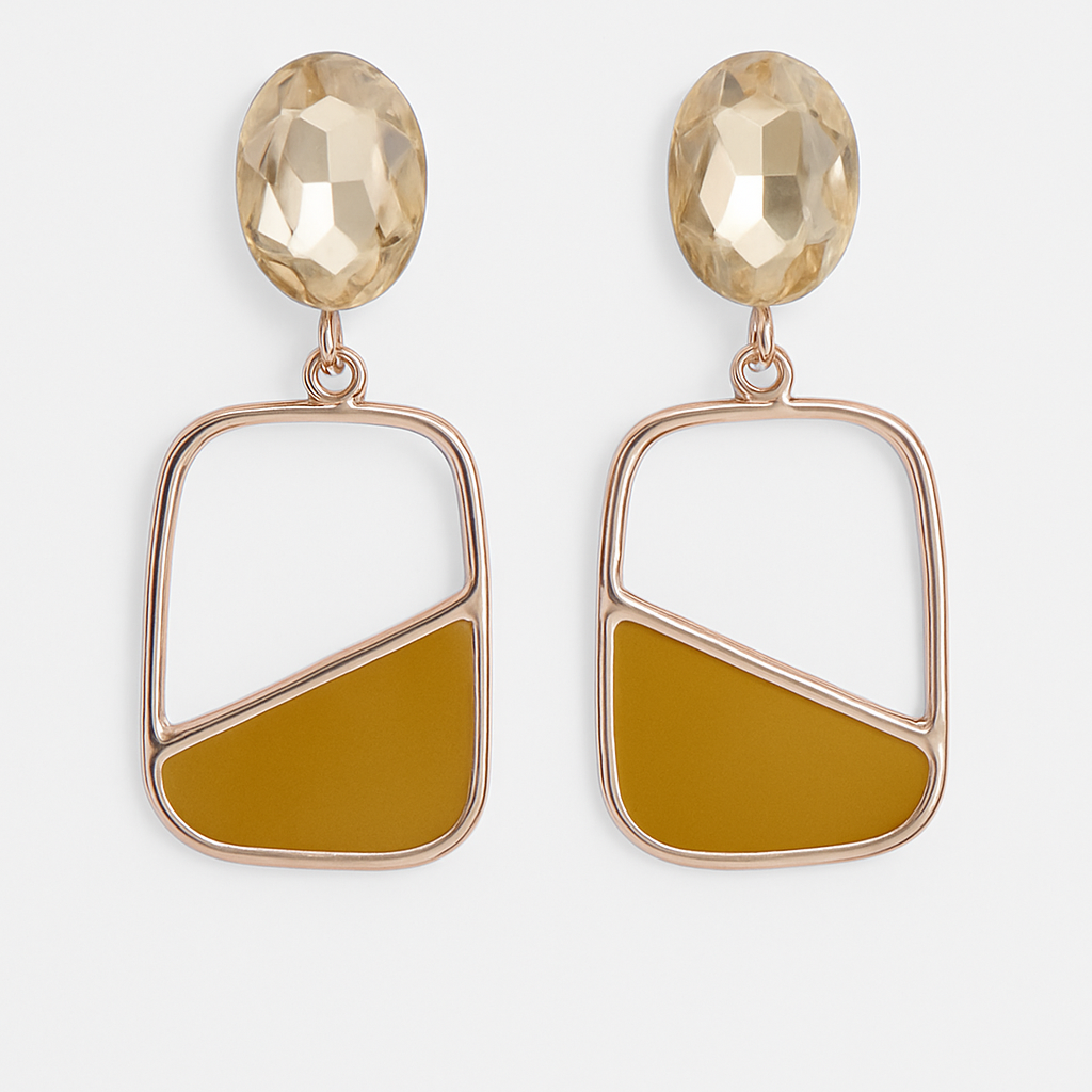 Elevate your style with these chic Golden Divide Geometric Drop Earrings. Featuring a striking two-tone design of warm mustard yellow and crisp white enamel, elegantly framed in a polished gold-tone setting. The sleek rectangular drop is topped with a brilliant, faceted clear stud, adding a touch of sophisticated sparkle. These modern, lightweight earrings are perfect for adding a contemporary flair to your everyday look or making a subtle statement for any occasion. Discover versatile fashion with this unique geometric design.