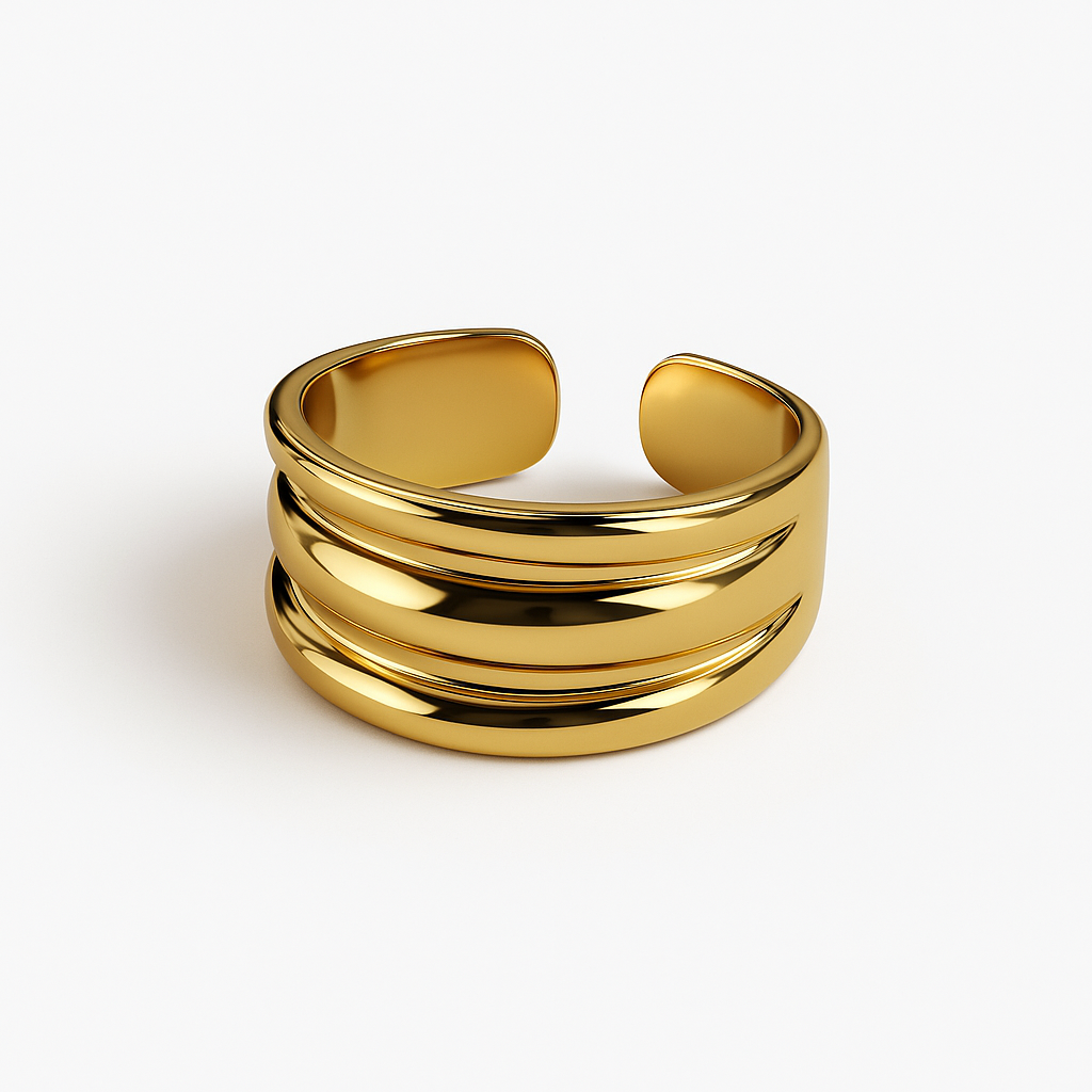 Elevate your everyday style with our Radiant Triple Layered Gold Ring, a modern and chic statement piece designed to captivate. This eye-catching ring features three sleek, polished bands seamlessly intertwined, creating a sophisticated stacked look without the need for multiple rings.